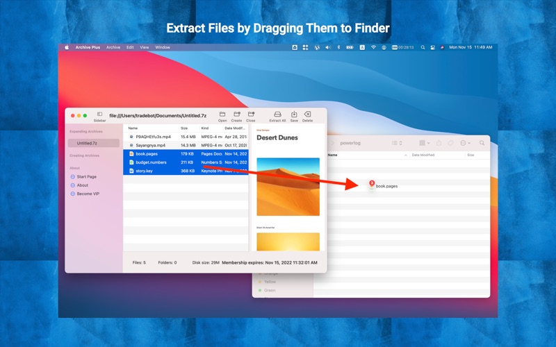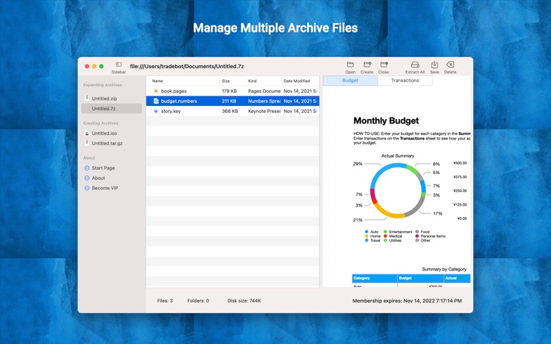Archive Plus is a better way to extract archives and compress files with file formats including zip, zipx, 7z, rar, jar, tar, gzip, gz, bz2, bzip2, xz, lzma, iso, cpio and many more. With Archive Plus, users will be able to - manage multiple archive files at once - preview and play files inside archive - extract files from an archive - edit an file with the App for that file and save the changes back to the archive - add files to an archive - delete files from an archive ● Manage multiple files Archive Plus can open and create multiple files in one session, all files are listed on the sidebar. ● Open and Preview archive, ⌘O Open archive file and preview its contents. Preview any file that Mac supports, such as PDF, Number, Page, Keynote, plain text, HTML, C source code, etc. You can even play video files inside an archive. ● Extract files with drag-drop Extract files and folder from Achive Plus to Finder with drag-drop. You can also extract all files from the menu or toolbar. ● Double click to edit file, and save the result back to the archive by ⌘S Double click on any file inside an archive to open it up with the default app that linked with that file format. For example, you can double click a .pages file, Archive Plus will launch Pages to let you edit that file. After making any changes, save the file in Pages. And use "⌘s" or the menu "Save archive" to save the result to the archive. ● Add files by drag-drop Add external files from Finder to Archive Plus by drag-drop. The change will be saved automatically. ● Delete files, ⌘-Delete Delete files or folders inside an archive by ⌘-Delete. The change will be saved automatically. ● Create a new archive, ⌘N Archive Plus can create a lot archive formats: zip, 7z, tar, tar.gz, tar.bz2, tar.xz, iso, and so on. After creating an empty archive, drag files to it from Finder. Note: some archive formats are read only, and Archive Plus is not able to make changes to them. RAR is such an example. Archive Plus makes archive management as easy as in Finder. Terms of Use: https://www.apple.com/legal/internet-services/itunes/dev/stdeula/ Privacy Policy: https://tigervpns.co.uk/archive-plus/privacy-policy/