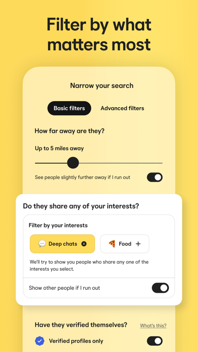 The dating app bringing people closer to love Bumble is the dating app where people meet, make connections, and start their love stories. We believe meaningful relationships are the foundation of a happy, healthy life — and we're here to help you find yours with a commitment to member safety and tools that empower confident dating. Match with the right people, date, and find meaningful connection Bumble is a free app for meeting singles and building connections grounded in mutual respect and trust. Whether you’re ready to find the one or date for fun, Bumble can help you connect with real people to build something authentic. As champions of love, we prioritize creating a space where our members feel respected, confident, and empowered to make connections - Our members are at the heart of everything we do - We put safety first — so you can date with confidence, knowing you’re connecting with verified matches - Respect, courage, and joy guide how we show up — and inspire others to do the same Try our free features — built to make dating easier - For better connections, conversations, and dates, personalize your profile with interests and prompts to showcase who you are, what you’re into, and what you’re looking for - Trust that the person you’re talking to is real with ID Verification - Feel confident with expert-backed dating advice designed to help you succeed - See what music you bond over by linking your Spotify account - Video chat and share your favorite pictures with your matches to get to know them better - Chat with peace of mind — knowing that when you’re talking to new people, all messages must meet our community guidelines - Get extra reassurance by sharing the details of your meetups with someone you trust - If you’re ever in need of a dating break, hide your profile with the Snooze Mode (you'll still keep all your matches) Want even more ways to connect? Bumble Premium unlocks extra features to boost your dating experience - See everyone who likes you - Use Advanced Filters like “What are they looking for?” to meet people who share your values, hobbies, and goals - Rematch with expired connections — so you don’t miss out on a great potential date - Browse anonymously with Incognito Mode and only seen by who you want to see you - Extend your matches by 24 hours - Swipe as much as you like to meet more people - Tap into dating scenes around the world with Travel Mode - Stand out and get noticed with free SuperSwipes & Spotlights, refreshed weekly Inclusivity is key At Bumble, we promise to support and include all forms of love: straight, gay, lesbian, queer, and beyond. We want everyone in our community to feel safe and welcome. So no matter how you identify, if you're looking for a place to chat, date, and find real love, we’ve got what you’re looking for. --- Bumble is a free dating app to download and use. We offer optional subscription packages (Bumble Boost & Bumble Premium) and non-subscription, single, and multi-use paid features (Bumble Spotlight & Bumble SuperSwipe). Your personal data is securely processed in line with our privacy policy and applicable laws—be sure to read our privacy policy and terms and conditions. https://bumble.com/en/privacy https://bumble.com/en/terms Bumble Inc. is the parent company of Bumble, Badoo, and BFF, social networks, and dating apps free to download and use.