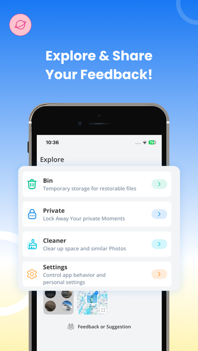 Discover an easy and private way to browse, organize, and manage your photos and videos with Gallery: Photo Vault & Cleaner. Designed for iOS, this photo management companion helps you view your media, clean unwanted files, and keep everything organized with smooth navigation and smart tools — all while your data stays safely on your device. - Browse & View Media • View photos, videos, and GIFs in clean grid or list layouts • Quick previews and easy access to albums - Smart Organization • Automatically group media by date and location • Sort files by name, size, or date • Keep your gallery structured the way you like -Location-Based Viewing • View photos on a map based on where they were taken • Works for media with available location data - Similar Photo Cleaner • Find similar or duplicate photos • Choose which photos or videos to remove • Free up storage with full user control - Search & Filters • Search photos and videos easily • Filter by date, size, type, or folder • Quickly find the media you need - Slideshows • Create slideshows from selected photos • Smooth transitions for a pleasant viewing experience - Built-In Photo Editor • Crop, rotate, and resize images • Adjust brightness, contrast, and saturation • Apply filters and blur selected areas - In-App Trash & Restore • Deleted items are moved to the app’s temporary bin • Restore photos or videos before permanent deletion - Dark Mode Support • Full Dark Mode for comfortable viewing • Ideal for night-time usage