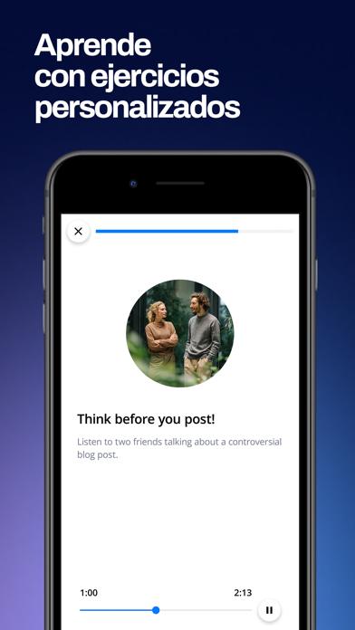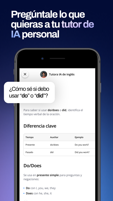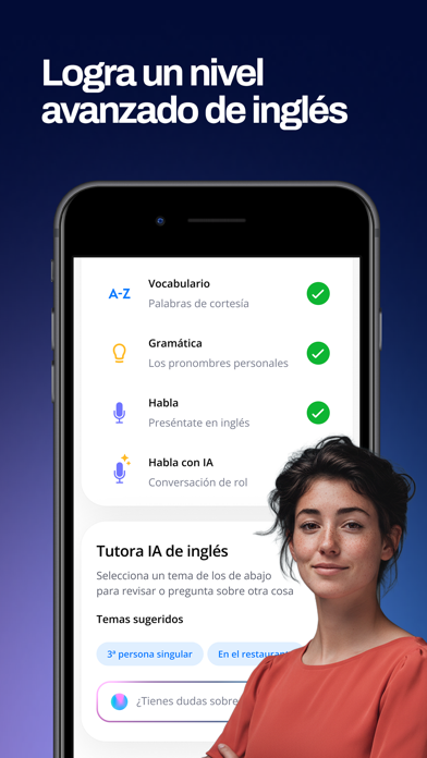 ¡Aprende a hablar inglés con fluidez con IA! Master English es una app de IA diseñada para adultos hispanohablantes que desean alcanzar un nivel avanzado de inglés para su carrera. Al instalar la app, te crearemos un programa personalizado, adaptado a tu nivel y necesidades. Con este programa podrás aprender todo lo que necesitas para hablar inglés a nivel avanzado. También ganarás confianza practicando conversaciones basadas en situaciones reales con avatares de IA. Y si tienes alguna duda sobre el aprendizaje del inglés, tu tutor de IA personal responderá tus preguntas. A medida que practiques con la app Master English, nuestra tecnología de aprendizaje patentada optimizará las lecciones según tu ritmo y te proporcionará feedback personalizado sobre tu pronunciación en inglés. Esto te permitirá mejorar tus habilidades en inglés de la manera más eficiente posible. Al completar el programa Master English, serás capaz de mantener conversaciones en inglés con confianza y aplicar a ofertas de trabajo donde el inglés sea un requisito. Nuestro programa ha sido creado por decenas de profesores de inglés certificados, especialistas en ciencia de datos e ingenieros altamente cualificados que trabajan arduamente en equipo para brindarte la mejor experiencia de aprendizaje en línea y ayudarte a alcanzar un nivel avanzado de inglés. En Master English, creemos que todos deberían tener la oportunidad de aprender a hablar inglés al nivel requerido para los trabajos mejor remunerados. Apoyamos todos los niveles de inicio: principiante, básico, intermedio o superior. El programa incluye de 3 a 5 lecciones de inglés por semana, cada una de las cuales toma unos 45 minutos para completarse. Dependiendo de tu nivel inicial y ritmo de aprendizaje, alcanzar un nivel avanzado de inglés tomará entre 6 y 12 meses. ¡Si estás dispuesto a invertir este tiempo en mejorar tu inglés, serás recompensado con excelentes resultados! TEN EN CUENTA QUE Necesitas una suscripción para acceder a nuestro programa y a las herramientas de esta aplicación. El cargo se lleva a cabo tras la confirmación del pedido desde la cuenta de iTunes. La suscripción se renueva automáticamente hasta que la renovación automática es cancelada al menos 24 horas antes de la finalización del periodo de pago vigente. Tu cuenta de iTunes será cargada mensualmente durante las 24 horas previas a la finalización del periodo de pago actual, salvo que cambies los detalles de tu suscripción en tus ajustes de cuenta. El precio mensual de la suscripción es siempre el mismo. Una vez completada la compra, puedes gestionar tu suscripción en los ajustes de cuenta. Si la suscripción es cancelada, el acceso a los cursos y las funciones de la aplicación expirarán al terminar el periodo de pago vigente. Términos de Uso: https://www.masterenglish.com/es-latam/terminos-de-uso/?hf=1 Política de Privacidad: https://www.masterenglish.com/es-latam/politica-de-privacidad/?hf=1 Comienza hoy tu camino hacia un nivel avanzado de inglés con la aplicación Master English. Es una decisión de la que nunca te arrepentirás. ¡Nos vemos al otro lado!