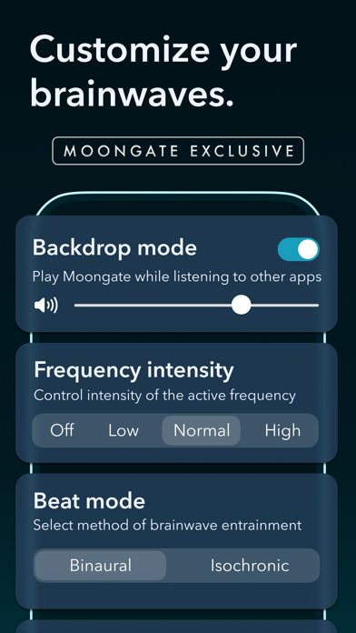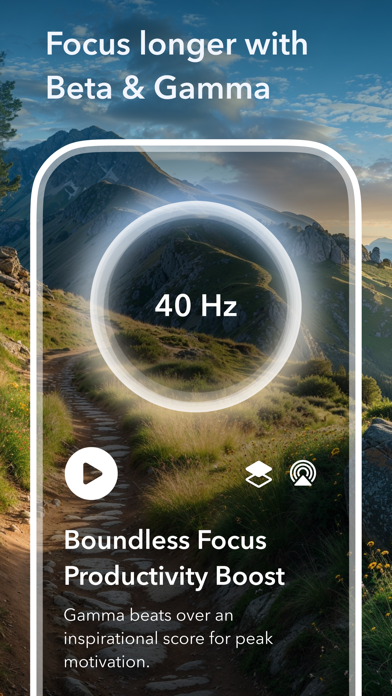 Fall asleep easier, release anxiety, calm racing thoughts, and stay focused with science-backed sound therapy. Explore immersive binaural soundscapes, featuring: - Delta, Theta, Alpha, Beta, & Gamma (40 Hz) brainwave binaural beats - 432 Hz, 528 Hz, & other Solfeggio music - Pure binaural & isochronic tones - White, brown, green, & pink noise - Rain sounds - Ocean waves - Night ambience - Calming music 100% VERIFIED BINAURAL BEATS “After having used Binaurals over the past few years, I can tell which ones are good and which ones aren’t or are total fake. These are by far the best.” –User review We analyzed hundreds of the top streamed binaural beats and found that **most don’t even contain the frequencies they claim to provide**, while many make false, even dangerous claims. Moongate only offers authentic binaural beats, verified through audio analysis and backed by research. CUSTOMIZE YOUR EXPERIENCE “On Moongate you can actually hear the frequencies and control them. It feels way more effective and less sketchy.” –User review Unlike other apps and websites, Moongate lets you adjust the intensity of the active frequencies in each soundscape. With Backdrop mode, you can even play Moongate while listening to other apps, like podcasts, audiobooks, and meditations. Easily access your top soundscapes with Favorites and Playlists. Seamlessly integrate Moongate into your routines with Timers, perfect for sleep, meditations, or work sessions. DELTA + THETA (0.1-4 Hz): Fall Asleep Faster, and Stay Asleep Longer “My sleep has improved dramatically since using this app!” –User review If you suffer from insomnia or have racing thoughts at night, Moongate can help. Studies show binaural beats can promote faster sleep onset, fewer wake ups, and enhanced sleep quality. GAMMA + BETA (14-100 Hz): Boost Concentration “Moongate has been a game-changer for my focus” –User review If you struggle with procrastination or have trouble staying on task, our soundscapes can shift your mind to a more focused, productive state. For example, 40 Hz Gamma binaural beats have been shown in studies to improve attention and working memory. THETA + ALPHA (4-14 Hz): Release Stress and Anxiety “I’ve noticed a change in my ability to relax even when I’m not using them.” –User review Moongate’s Theta and Alpha frequency soundscapes help guide the mind to a state of peace and relaxation. Studies have shown binaural beats can relieve anxiety, reduce stress, and improve overall mood. THETA + ALPHA, continued: Enhance Meditation “This app has rich binaural beats that have helped with my meditation practice and sleeping tremendously” –User review Alpha brainwaves manifest during light meditation, while Theta brainwaves are present during the deepest meditative states. By inducing these brainwave patterns, binaural beats can facilitate more effective meditation sessions. HEALING FREQUENCIES (432 Hz, 528 Hz, etc): Sound Healing and Spirituality “10/10 would recommend for meditating, refocusing and rejuvenating your mind, body, and soul.” –User review Moongate offers a range of frequencies commonly used in spiritual practices: - 432 Hz, renowned for its pleasing, relaxing effects - 528 Hz, used in many applications, including relaxation and spiritual transformation - 396 Hz, for meditations focused on releasing guilt, fear, and other negative emotions - 417 Hz, symbolizing change and overcoming negativity - 639 Hz, for mindfulness around healthy relationships, empathy, and compassion - 741 Hz, often used for spiritual cleansing and renewal - 852 Hz, associated with intuition and spiritual connection with the universe START YOUR JOURNEY TODAY “I have used 20 different sound/meditation apps and I find these binaural beats to be the best!” –User review Step through the Moongate, and experience the difference for yourself. Your journey to better mental health begins now. Terms of Use: https://www.apple.com/legal/internet-services/itunes/dev/stdeula