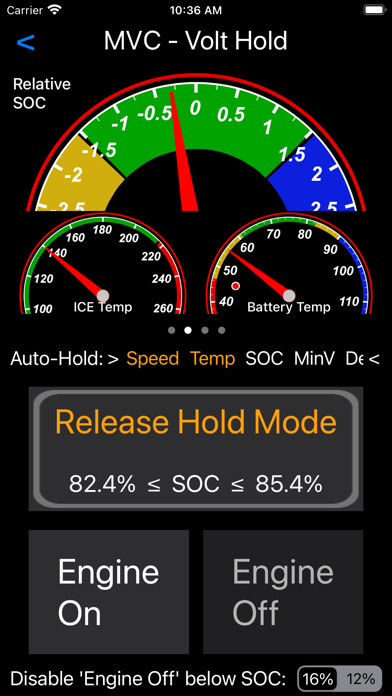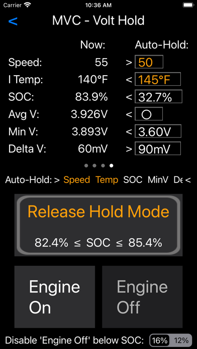 MyVoltControl is designed specifically for the Chevrolet Volt (and related models), and the Chevrolet Bolt. ("Related models" include the Cadillac ELR, Cadillac CT6, Opel Ampera, Holden Volt, Opel Ampera-e.) MyVoltControl requires the use of an OBD adapter that complies with the ELM327 specification (most do). You can use either: - an OBDLink MX+ OBD adapter (preferred) - an OBDLink MX-WiFi OBD adapter - a Bluetooth-Low-Energy (aka Bluetooth 4) OBD adapter. (Classic bluetooth adapters are not supported by iOS.) - a generic WiFi OBD adapter will work in most cases (but is not recommended). If you need to buy an adapter, or to see a list of some that aren't ELM327 compatible, refer to the information in our FAQ page at http://www.CraftinDeApps.com/FAQ#MVC These adapters plug into the OBD-II port under the left side of your dash. The App itself is free. Use of the functions described below requires one-time in-app purchases to enable each one that you want to use. MyVoltControl consolidates four functions, long available for other phones, and makes them available for the iPhone and iPad. In addition, the last one is unique to this app. These are known as: -->> MyVoltHold -->> MyVoltLifetime -->> MyVoltDiag -->> MyVoltAfterblow -->> MyVolt12v -->> The Volt Hold function does four things. - First, at the top, it has several "information pages" that you can switch between to see information about your car. These are shown in the photos above. - Second, it allows you to turn on a "Hold" mode which approximates the Hold mode built into the car beginning with the 2013 model. This Hold mode turns on the internal combustion engine (ICE) as needed to try to maintain a State of Charge value that is close to the charge that was present when you turned the mode on. So why, you may ask, would I want that function on a newer car. Very simple really. Since Sport mode and Hold mode are mutually exclusive, this function allows you to use the car Mode button to engage Sport mode, while using the Hold function in this App to achieve Hold mode at the same time! Hold mode can also be automatically engaged based on several factors. - Next, it allows you to ask the car to run the internal combustion engine. You can use this to get heat from the engine on a cold morning, or to manually simulate your own Hold mode if you prefer. - Finally, you can also use this function to force the ICE off, which you might want to do if the ICE is running due to low temperature (done for driver comfort). The Volt Hold function is not available (and would serve no purpose) on the Chevrolet Bolt models. -->> The Volt Lifetime function allows you to reset the lifetime fuel economy value ("Lifetime MPG" or "Lifetime L/100km") value for your car. You will find this useful if you've purchased a car which has recorded the previous owner's fuel economy results. You can also use this to calculate the distance travelled in both EV mode and on the ICE by entering the Lifetime Economy number shown on your dash. The Volt Lifetime function is not available (and would serve no purpose) on the Chevrolet Bolt models. -->> The Volt Diag function allows you to run some tests on your high-voltage (traction) battery. -->> The Volt Afterblow function allows you to control a system that GM added to your car to dry out the A/C vents. This system is OFF by default and the Volt Afterblow function allows you to turn it on (or back off). This app function is not available for 2013 model year cars. - You can use the Volt Afterblow feature ONLY if you are using an OBD adapter which supports the SWCAN (aka GMLAN) bus. It must also support the "ST" command set (in addition to the common "AT" command set). Very few adapters offer this support. The known to be good and recommended adapters for this are the OBDLink MX+ or the OBDLink MX-Wifi adapters. -->> The Volt 12v function displays graphs showing the values of voltage and current on your 12 volt battery.