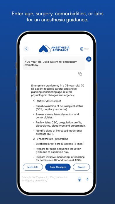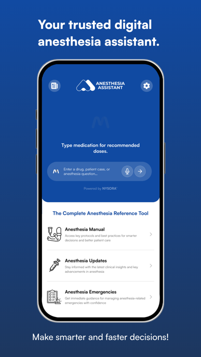 Get fast, accurate anesthesia insights, smart dosing, and personalized case plans. NYSORA Anesthesia Assistant is your ultimate digital tool for clinical decision-making. Trusted by anesthesiologists, residents, and pain management specialists, this app simplifies your daily anesthesia practice with real-time updates and smart clinical tools. Key Features: - Meds Info: Access accurate drug dosing, infusion rates, contraindications, and more instantly. - Case Manager: Create personalized anesthetic and perioperative plans tailored to each patient’s specific needs. - Anesthesia Updates: Stay ahead of the latest research, clinical guidelines, and groundbreaking studies in just 10 minutes per update. - Search: Find the information you need quickly with our intuitive search feature, helping you stay on top of your practice. Why Choose NYSORA Anesthesia Assistant? - Fast & Reliable: Get quick, clinically relevant updates and insights whenever you need them. - Tailored to You: Personalized anesthesia plans and decision-making tools that integrate real-time data and evidence-based recommendations. - Peer-Reviewed Content: All app content is reviewed by the NYSORA Educational Board, ensuring the highest quality and the latest advancements in anesthesiology. - Easy to Use: Simplifies complex processes and streamlines your daily workflow for improved efficiency and patient care. Download NYSORA Anesthesia Assistant today and experience how it can simplify your practice and improve patient outcomes.