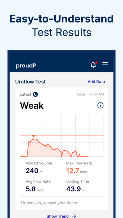 Known Your Flow. Live with Confidence. Noticing a weak stream, frequent trips, or nighttime urination? proudP lets you check your urine flow at home using just your smartphone. Many men notice changes over time — weaker stream, more frequent bathroom trips, or waking up at night to pee. Guessing can be stressful. proudP gives you a simple way to check. ■ What proudP does proudP is an at-home urine flow test app that uses acoustic AI to measure urine flow with your smartphone — no clinic visit required. ■ Why men use proudP • Check urine flow privately, at home • Get objective data instead of guessing • Prepare for a more informed conversation with a doctor • Designed for sensitive men’s health needs ■ How it works • Take a quick flow test using your phone • Get objective urine flow insights in under a minute • Track changes over time • Use the data to decide what to do next ■ What to expect • 1 free urine flow test included • Additional tests available in-app • Results are informational and not a medical diagnosis A simple first step Whether you’re just curious, losing sleep to nighttime bathroom trips, or noticing frequent urination, proudP helps you understand your urine flow — on your own terms. For more information, please visit www.proudP.com • Terms of Use: https://www.proudp.com/terms • Privacy Policy: https://www.proudp.com/privacy About payment Upon purchase confirmation, charges are billed to your Apple ID account. For subscriptions, you can manage and cancel in your App Store account settings after subscribing. Pricing Options 1. Before seeing doctor, 'One-Time test' If you're not sure about seeing a doctor yet, start with the One-Time Test. What's included: - 3 urine flow tests - IPSS (International Prostate Symptom Score) survey - A printable report ready to share with your health care provider 2. For Ongoing Monitoring Take urine flow test, symptom questionnaires, and see the change on numbers over time. Recommended for checking treatment effectiveness or comparing results before and after interventions. Choose a Monthly or Yearly Subscription to get: - Unlimited uroflowmetry tests - Symptom trend tracking - Full access to your test history and data insights" * Disclaimer: In the US., proudP an FDA Class 2 uroflowmetry device to measure urine flow. It is not a substitute for medical advice, diagnosis, or treatment, and does not replace professional care or the practice of medicine. Do not make medical decisions based solely on proudP. Always consult your healthcare provider, proudP is intended for adults aged 18 and older.
